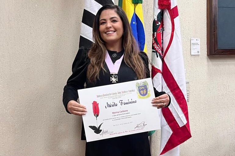 Com uma trajetória sólida no empreendedorismo e mais de duas décadas de dedicação ao setor da moda, Marina Carbone foi homenageada na Câmara Municipal de São Paulo com o Diploma e Comenda do Mérito Feminino – Grau de Dama Comendadora, concedido pela Academia Brasileira de Ciências, Artes, História e Literatura (ABRASCI).